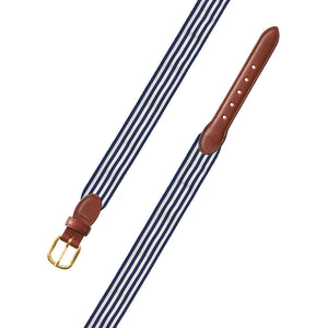 Thin Stripe Navy & White Grosgrain Ribbon Leather Tab Belt